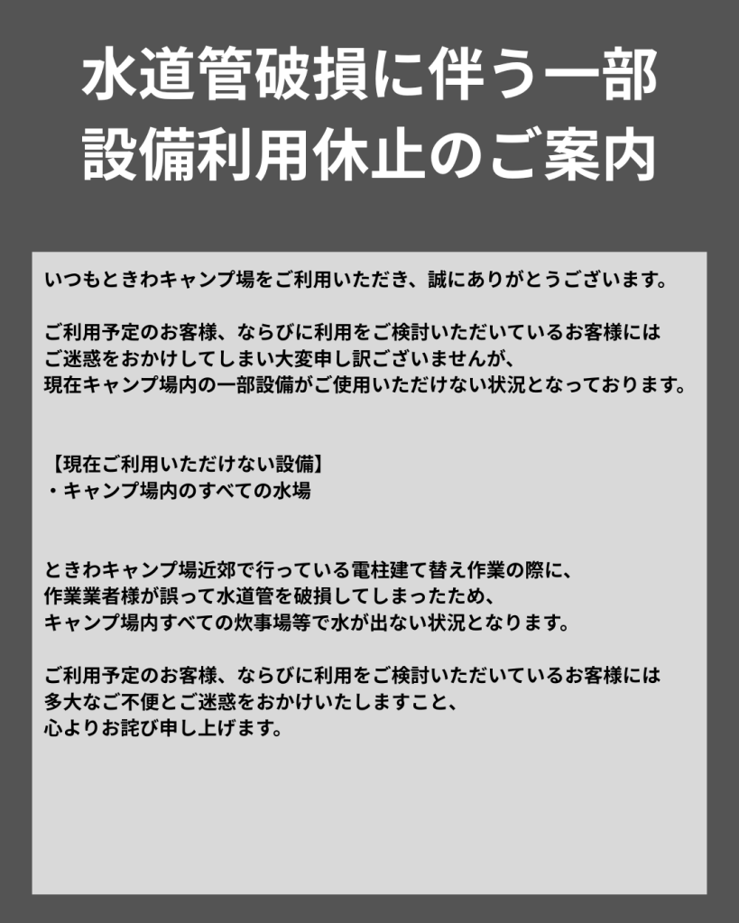 まさかの近隣の工事の際に水道管が破損してしまったようで、キャンプ場内全ての水場のご利用が不可能になってしまいました…